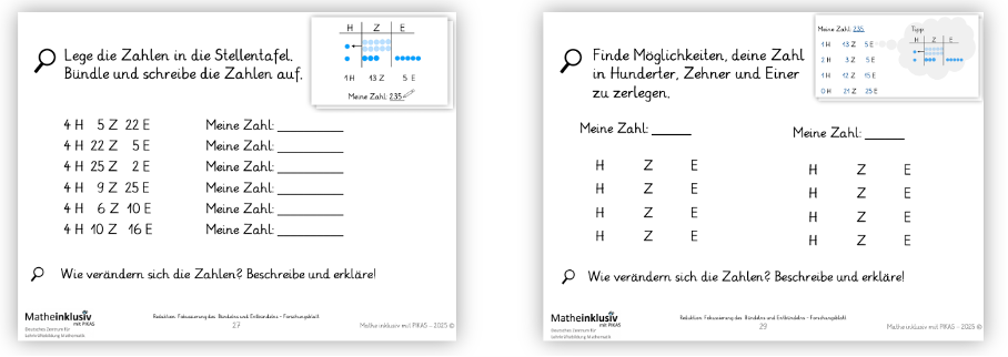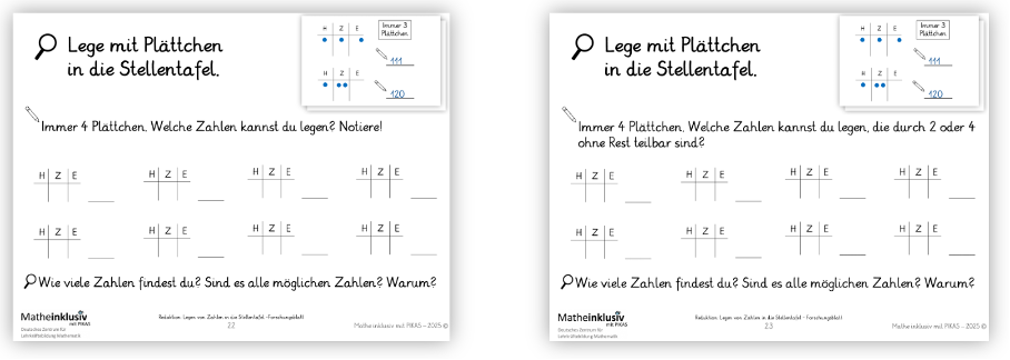 Abbildung 10: Forschungsblätter aus dem Materialpaket zu „Zahlen in die Stellentafel legen“
