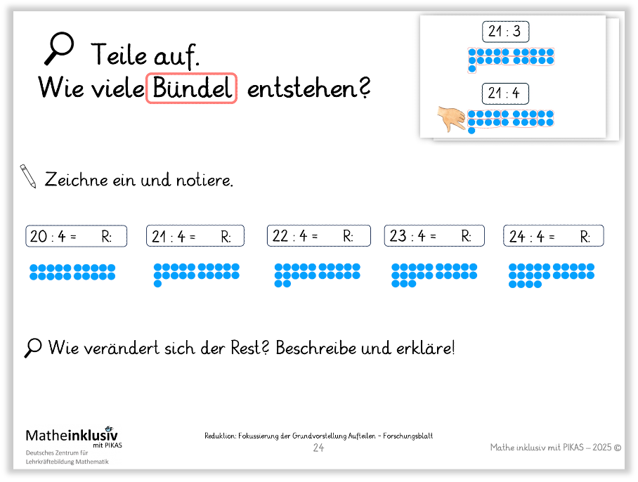 Die Kinder erhalten ein Forschungsblatt zu Fokussierung des Aufteilens sowie Plättchen. Sie sollen die Gesamtmenge mit dem vorgegebenen Divisor aufteilen, indem sie die Bündel (ggf. nachlegen) einzeichnen und die Anzahl der Bündel notieren.