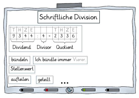 • Eine Aktivität könnte das Erklären des Kartensets „Schritte der schriftlichen Division“ sein. Dazu können die Kinder ein Lernvideo aufnehmen und den schriftlichen Divisionsalgorithmus fiktiven Kindern materialgestützt erklären.