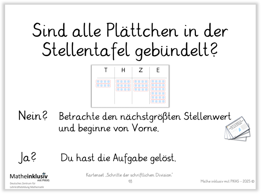 Im Kartenset „Schritte der schriftlichen Division“ wird das Aufteilen des 1. Stellenwertes exemplarisch abgebildet. Danach beginnen die Lernenden das Kartenset von vorne und übertragen das Aufteilen auf die weiteren Stellenwerte. Sie können sich sukzessive von den Karten des Sets als Unterstützung lösen.