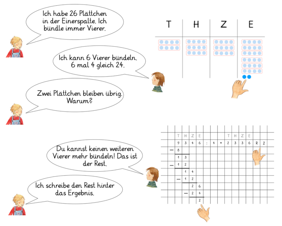 Bei der Förderung der Basiskompetenz Ziffernrechnen geht es darum, Algorithmen nachzuvollziehen und verständig zu nutzen. Durch die Anwendung eines Kartensets (s.u.) und der Arbeit mit Material mit der Stellentafel vollziehen die Kinder den schriftlichen Algorithmus handlungsorientiert und verstehensorientiert Schritt für Schritt nach. Dabei vertiefen sie das Operationsverständnis des Aufteilens als eine Grundvorstellung der Division. Sie verbinden den Begriff des Aufteilens mit einer konkreten Handlung, indem sie die Fragestellung „Wie viele Bündel entstehen?“ am Material durch die wiederholte Bündelung einer Plättchenmenge begleiten. Das Stellenwertverständnis wird durch das stellenweise Aufteilen und das Entbündeln der Reste gefördert und durch konkrete Handlungen mit Material an der Stellentafel.