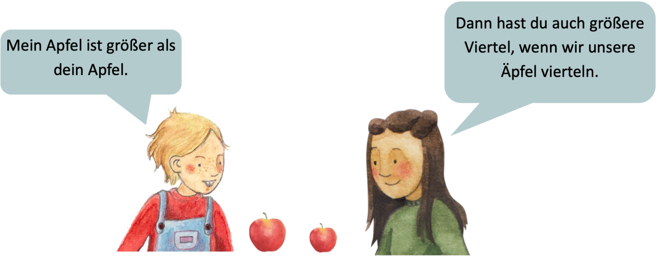Bruchteile mit gleichem Namen können ungleich groß sein. Eine Hälfte eines kleinen Apfels ist kleiner als die Hälfte eines großen Apfels (Schmassmann & Moser Opitz, 2001, S. 72). Die Lernenden müssen sich bei Brüchen - wie auch schon bei den natürlichen Zahlen – von der Wahrnehmung einzelner Objekte lösen.