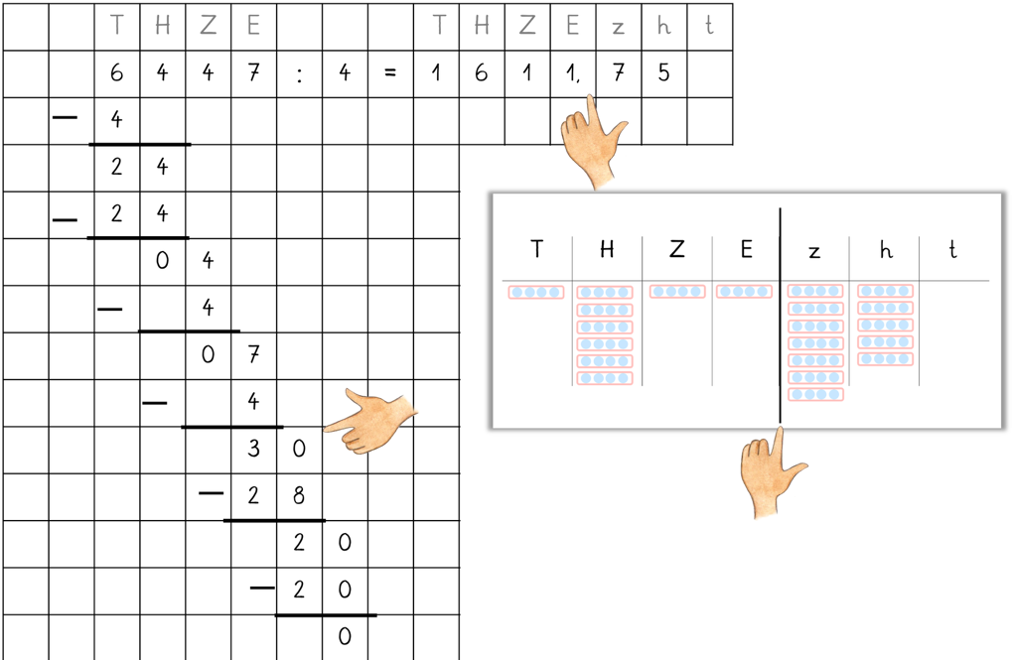Anmerkung: Es ist wichtig bei den Beschreibungen der Kinder auf die Anzahl der Plättchen in der Stellentafel zu schauen und diese aufzuteilen. Wenn beispielsweise die Frage ist, ob die 3 in die 1000 passt, lässt sich das auf Zahlenebene lösen. Wird diese Aufgabe auf Ziffernebene gelöst, würde man zu dem Ergebnis kommen, dass die 3 nicht in die 1 passt (ohne dass eine Dezimalzahl entsteht). In der Stellentafel wird der Tausender jedoch durch 1 Plättchen in der Tausenderstelle dargestellt. Dieses 1 Plättchen lässt sich nicht aufteilen.